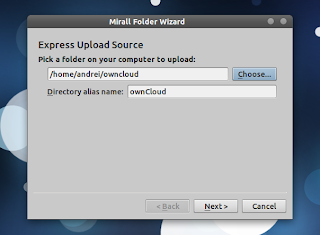 4. From the Mirall tray icon, select "Add folder", select "Choose" and select a folder that will be used as the local ownCloud sync folder (like the "Dropbox" folder for Dropbox). Then click "Next":