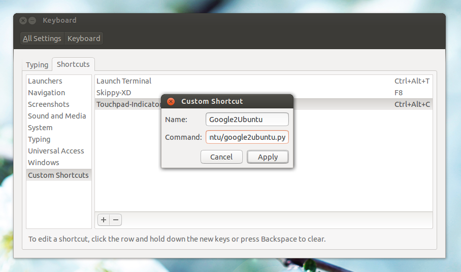 - in Unity/GNOME, open System Settings > Keyboard > Shortcuts, then click on Custom Shortcuts on the left, click the "+" button and add "/usr/share/google2ubuntu/google2ubuntu.py" for the command and "Google2Ubuntu" for the shortcut name. Then assign it a keyboard shortcut (I've used F7 in my test).