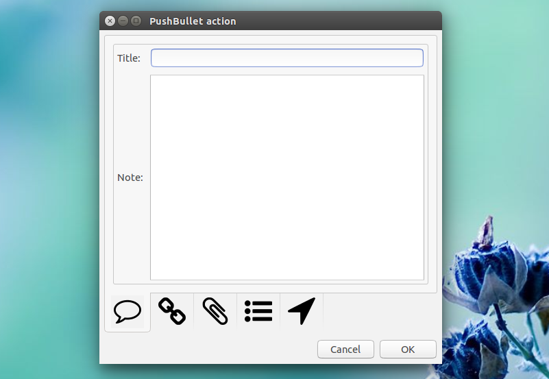 That's it, you can now start using Pushbullet. To send a file/text/link/etc. from Ubuntu to your Android or iOS device using Pushbullet Indicator, select the device from the indicator menu, then click the appropriate tab: message, link, file, list or address: