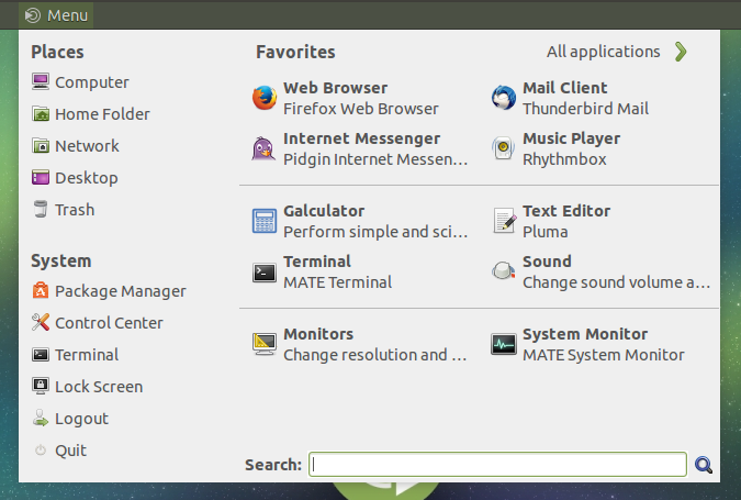 - MATE Menu (a MintMenu fork) - a searchable menu for the MATE panel. This is not the default menu, but you can add it to the panel by right clicking the panel, selecting Add to Panel and then adding "MATE Menu";