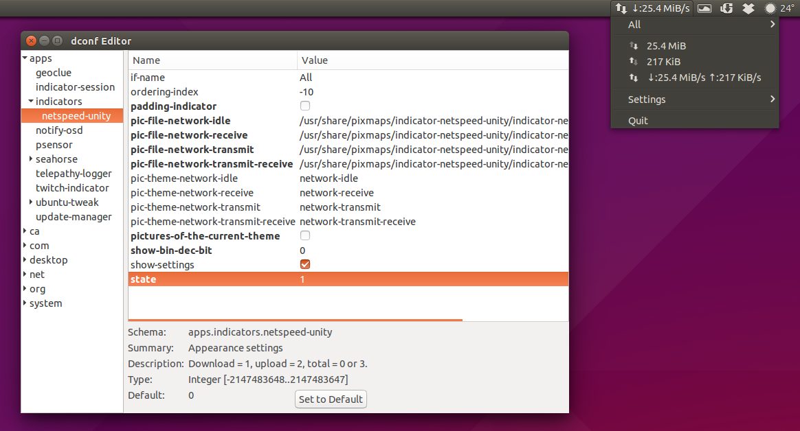 sudo apt-get install dconf-editorThen navigate to apps > indicators > netspeed-unity and change the settings to suit your needs. Note that changing some of the settings that are only available via Dconf Editor requires restarting the indicator to apply them.