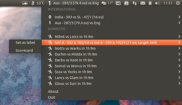 The indicator displays both international and domestic live cricket scores in the AppIndicator menu and allows you to set any match as the label (so the live score shows up directly on the panel).