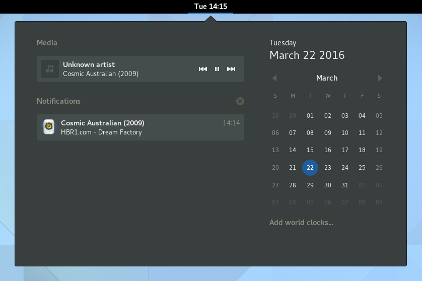 There is one change that stands out though: media controls are now displayed in the notification / clock area, so users have quick access to music and video apps (which support MPRIS) that are currently in use:
