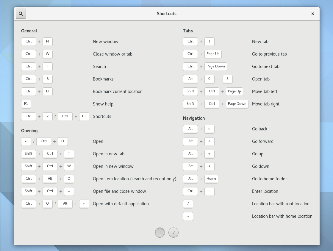 Another interesting change is the addition of a shortcuts window to quite a few GNOME applications, like Files (Nautilus), Gedit, Maps, Videos, Photos and others. The shortcut window displays the keyboard shortcuts as well as available multitouch gestures, and can be accessed from the application menu or by using Ctrl + ? or Ctrl + F1 shortcuts. Here's the Files shortcuts window as an example: