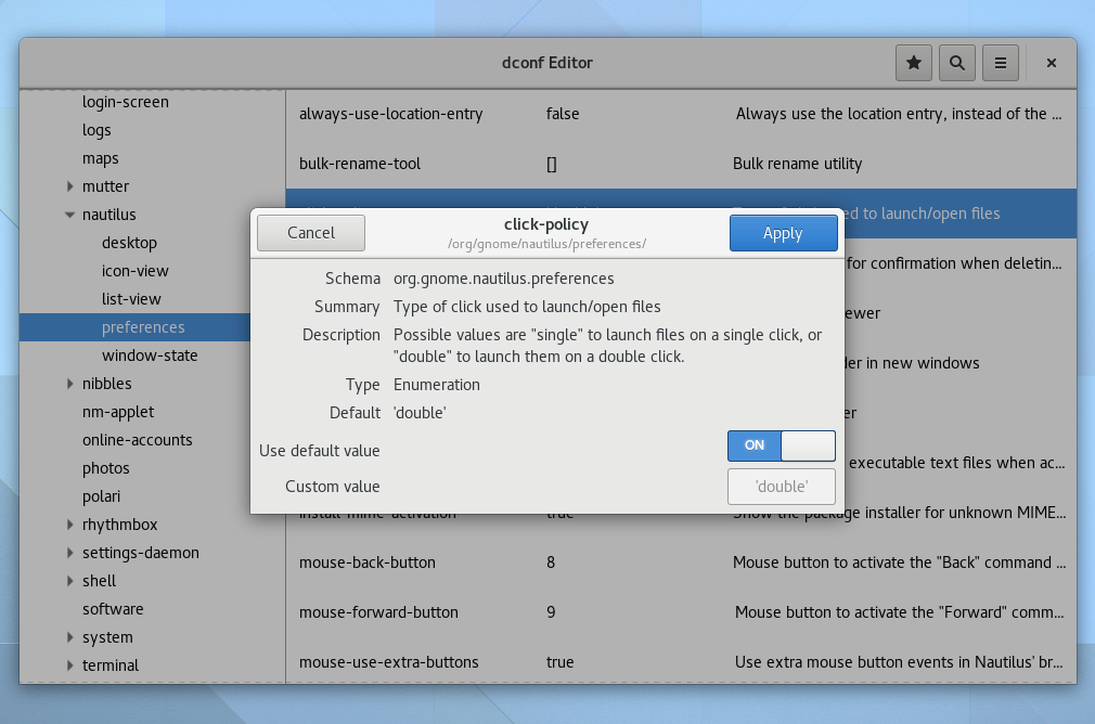 Other dconf Editor changes include a new bookmark feature, useful to quickly access some often-used settings, a redesigned entry editor (I'm not sure exactly how this is called), which integrates a "use default value" switch that allows you to easily revert the changes to default, along with other useful improvements, like options to copy current path and reset visible keys.
