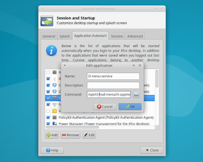 Xubuntu: To add i3-appmenu-service.py to startup, launch Session and Startup from the menu / System Settings, and on the "Application Autostart" tab click "Add", enter "i3 menu service" under "Name", and "/opt/i3-hud-menu/i3-appmenu-service.py" (without the quotes) under "Command":