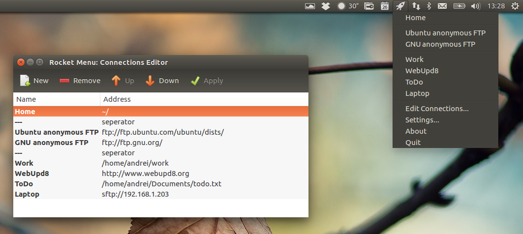 Rocket Menu is an AppIndicator for opening files, directories, and making connections to remote servers via Nautilus.