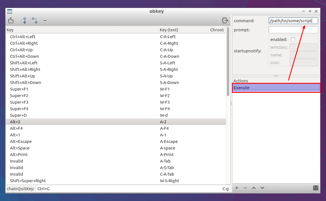 If you want to add a custom action, like running some application or script, select "Execute" as the action, and add the command in the top right pane: