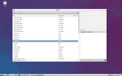 obkey ~/.config/openbox/lubuntu-rc.xmlIn the Obkey window, you'll notice a long list of keyboard shortcuts. The actions are not displayed in this list. To see the action for a certain keyboard shortcut, you must select it, then look under "Actions" on the bottom right.