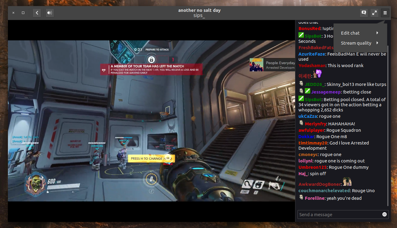 | A live stream in GNOME Twitch 0.3.0 with the mpv backend and Twitch chat enabled |